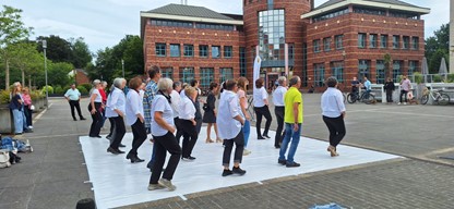 Am 1. Samstag – wir hofften auf einen Veranstaltungstag ohne Regen – rollten wir unsere Tanzfläche vor der Rathausgalerie gegenüber dem Café Mokka aus und Rosy eröffnete mit ihrer Line Dance Classic Gruppe ihre Performance.